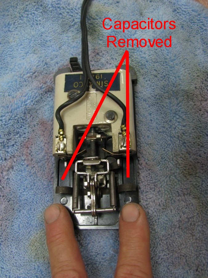 In the photos below you will see the foot control with the cover removed revealing 2 capacitors.